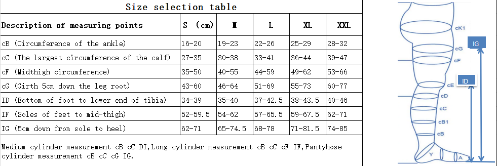 How to measure ankle Circumference (CB). Calf circumference (CC). Thigh circumference (CG) Maximum hip circumference (CH). Knee height (from foot to knee)(ID). Thigh height (from foot to thigh)(IG).