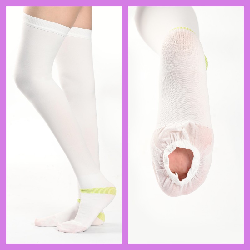 Anti embolish stockings 1. Comfortable broadband to prevent slippage and binding 2. Open sole of foot, easy to monitor blood circulation without removing stockings 3. Compression grade: Grade I 4. Color: white